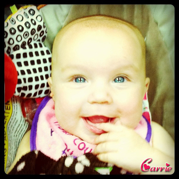 Ellie is my little snuggle bunny these days. She loves to get cozy and enjoy a pacifier and some snuggles in the middle of the afternoon. She “sings” herself to sleep in her car seat. She is rolling back to front, but not front to back yet. She can sit up with assistance.Carrie loves to play. She loves being bounced on Dad’s knee or tickled under her chin. She is very, very chatty. We even discovered that she’s cutting her first two teeth tonight! She tries to sit, like her sister, but prefers to stand up straight and tall.