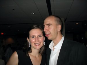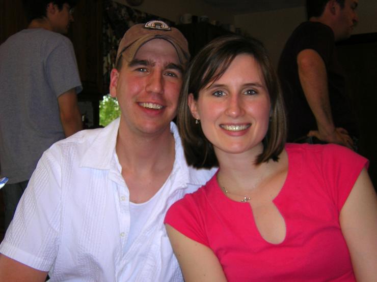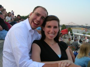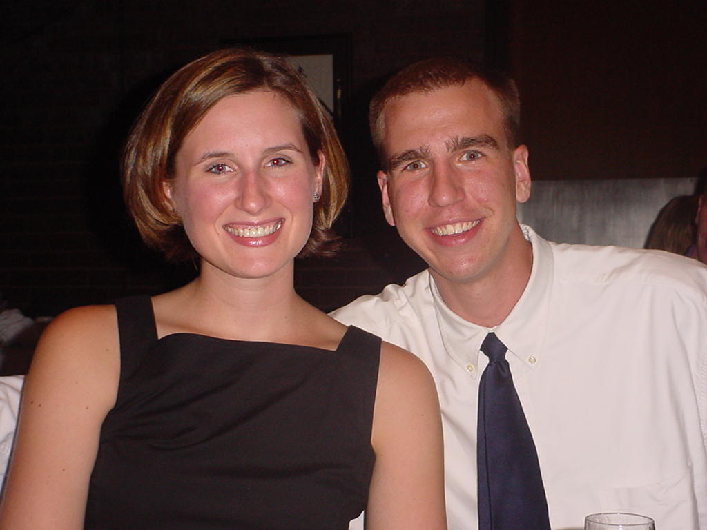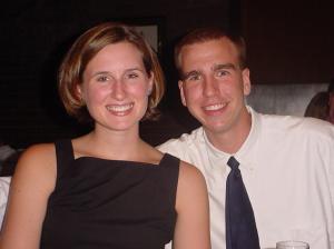 Frank and I attending a wedding.  The Bright Wedding.  July 13, 2002, I believe.  I could be wrong.  Maybe the 16?  Who knows.  This was our first “nice” couple picture.  Frank would be the first to point out to everyone that he had hair when we started dating. Apparently pro-longed exposure to Emily either results in losing your hair or moving to Oregon.