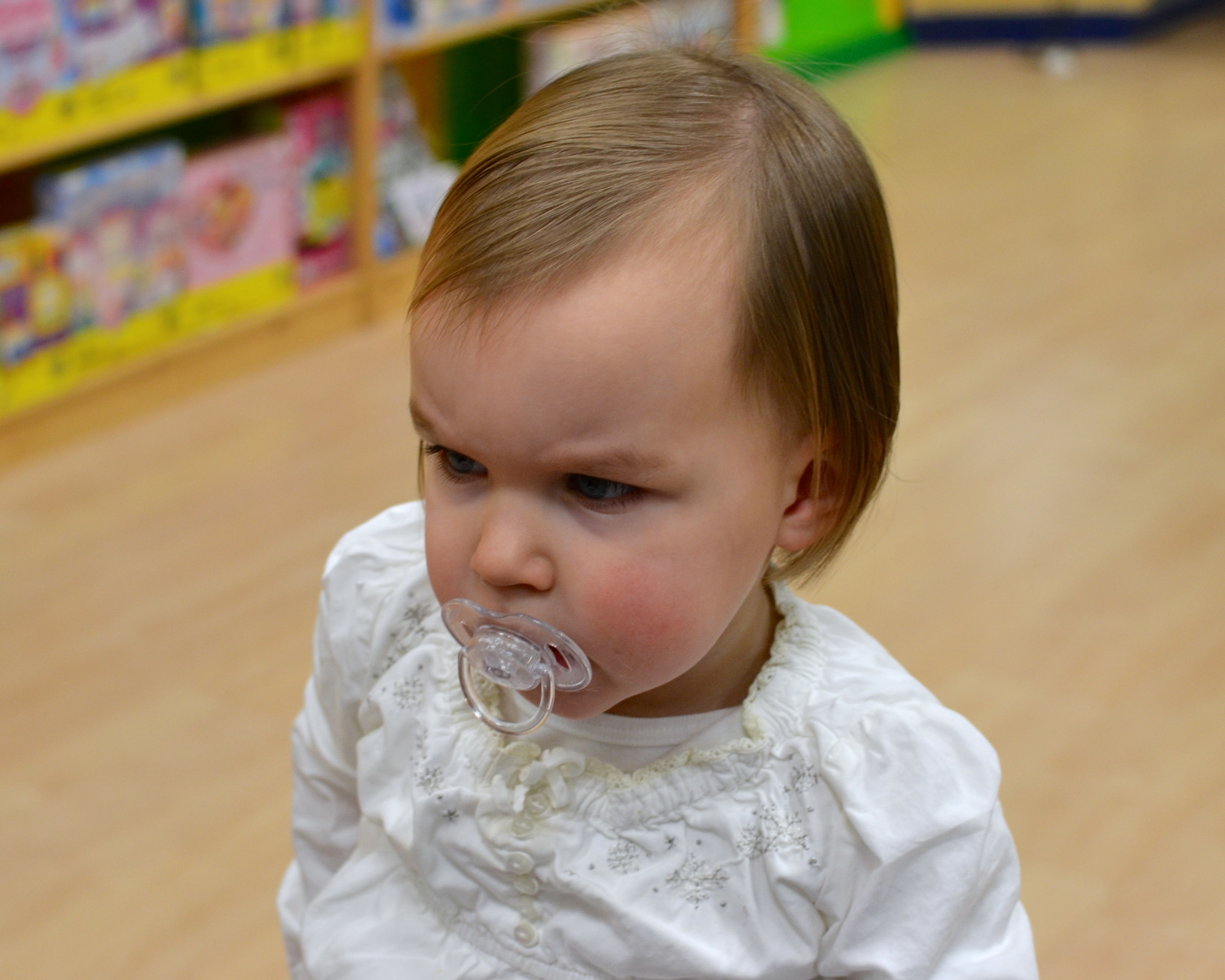 Annie says a few words that sound like “Hi!” and “Daddy!” and “MAMAMAMAMA” and so on.  I’m terrible at understanding baby talk. I’m lucky if I understand half of what the twins are hollering at me from the third row of the minivan.  All that to say: Annie may be reciting soliloquies from Shakespeare and I have absolutely no idea.