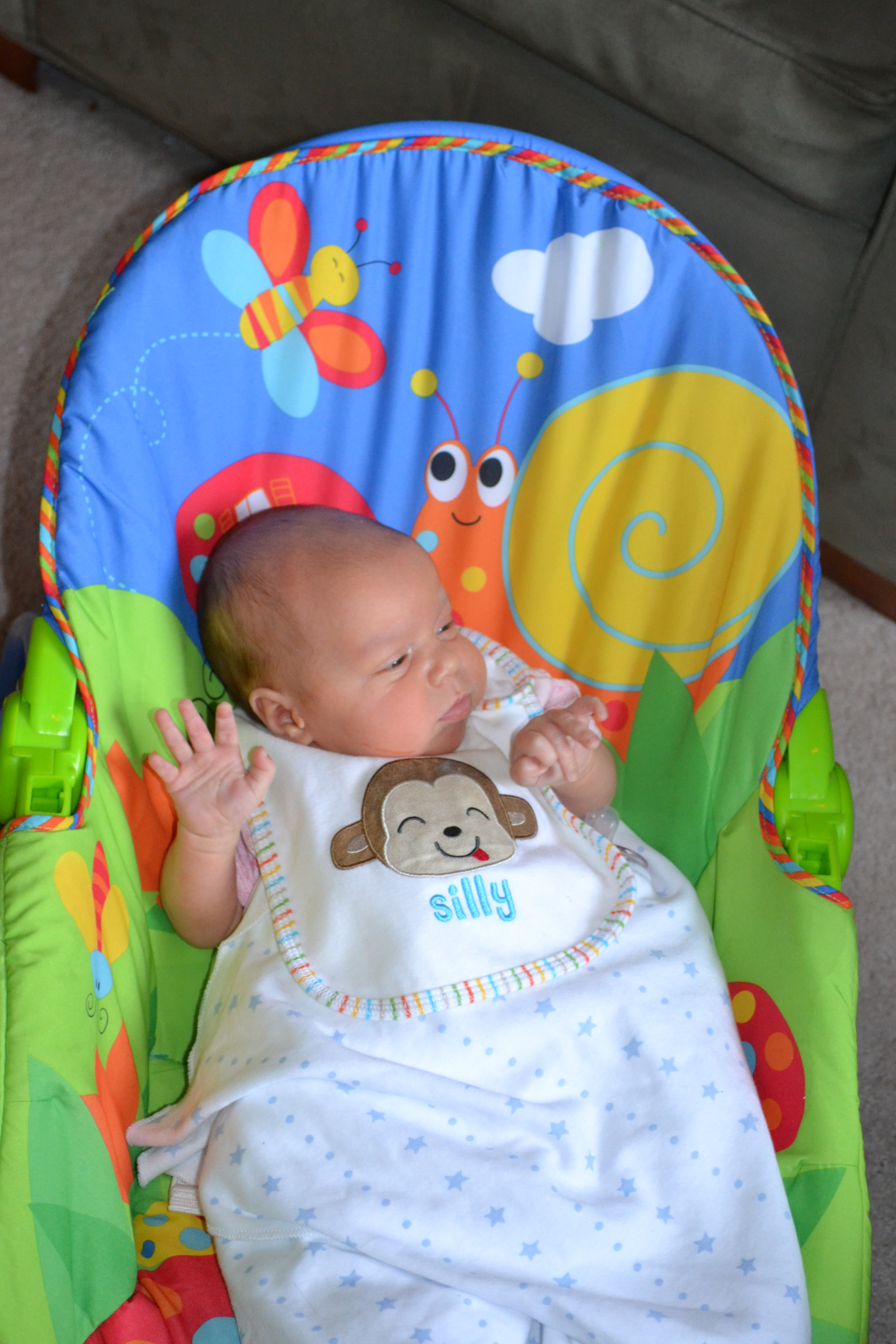 Meanwhile, sweet Carrie was sitting quietly in her bouncy seat, staring out the window and plotting.  I’m sure she will not let herself be outdone by her sister.