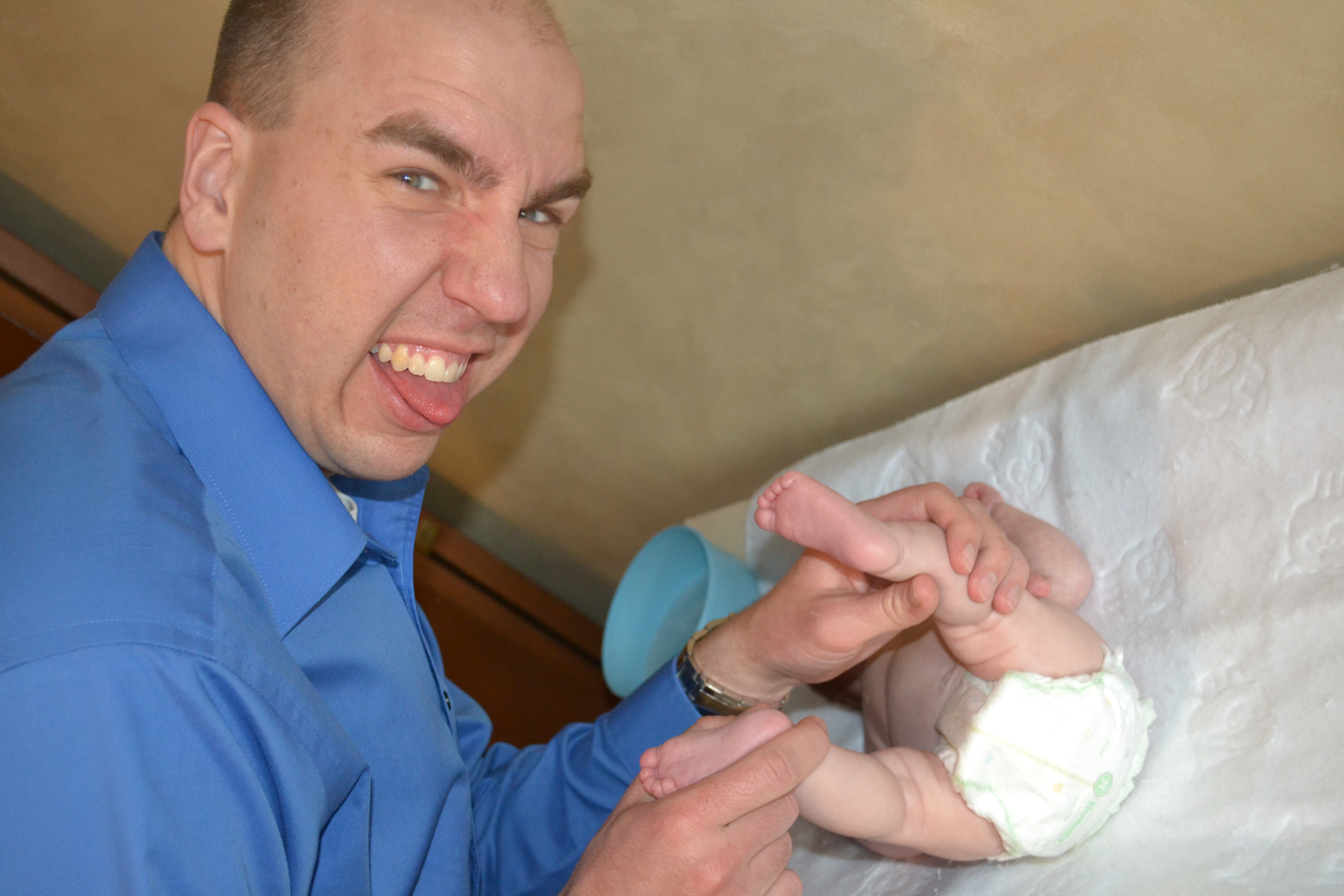 This was curious because she wasn’t wet when I put her down and she didn’t have any signs that she had spit up. Frank decided to check her diaper upstairs in the nursery.  Mistake number one.